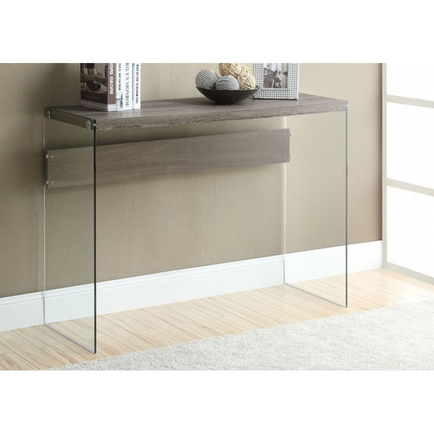 Enhance the look of your home with this chic dark taupe reclaimed wood-look sofa console with sturdy thick tempered glass sides. Use this multi-functional table to show case lamps, decorative display items, or simply as an accent piece.