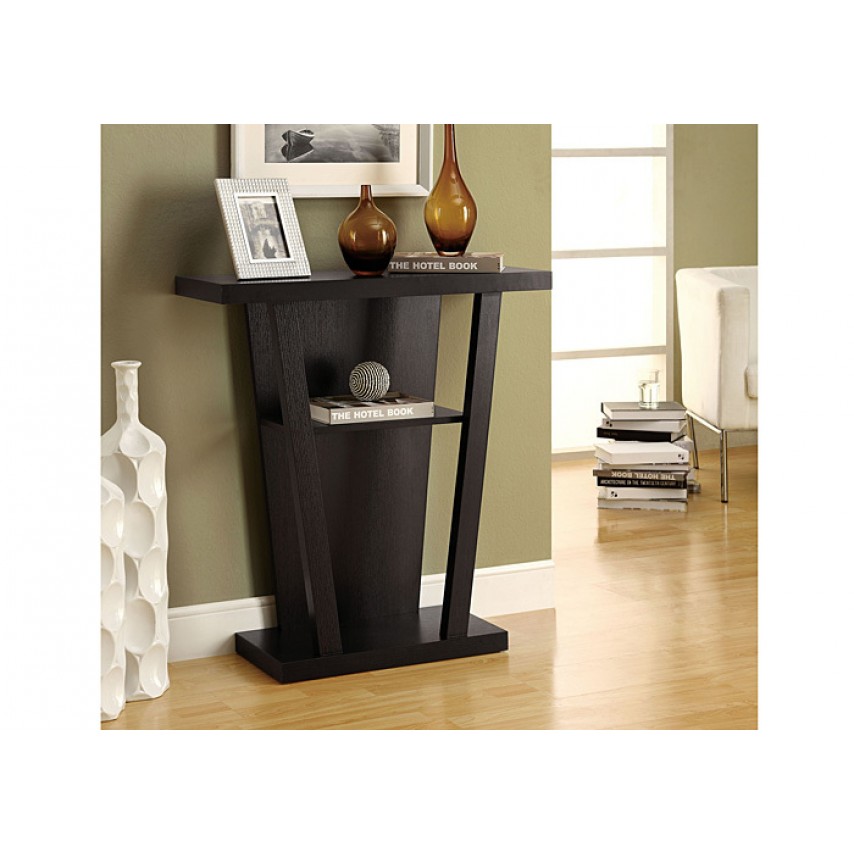 Grab your guests' attention with this white or Cappuccino finished hall console accent table. This sturdy 32" long solid-wood table has symmetrical lines and a unique flair. Great for displaying pictures, decorative pieces or books, this piece is sure to be a great addition to your hallway.