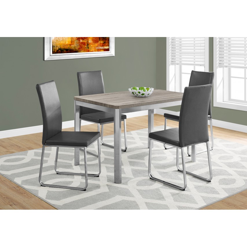 Get ready to bring a wow factor to your dining space with this bold, modern rectangular dining table. While the one inch thick table top has a warm dark taupe reclaimed wood-look finish, it contrasts beautifully with an edgy chrome apron and sturdy square metal legs. This versatile table comfortably seats up to 4 people for fun get-togethers in a formal or casual dining room or kitchen setting. The compact size will bring a room to life in small homes, apartments, or condos. Chairs are sold separately.